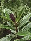 Les feuilles opposées, décussées, portées par un pétiole fort et court, sont coriaces, charnues, persistantes, de 5–20 × 2∙5–8 cm[9], de couleur vert foncé à vert jaunâtre, brillantes dessus, de forme elliptique à obovale, de marge entière et pigmentée de rouge.