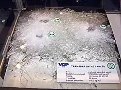 Note : Le terme « verre anti-balles » est un abus de langage et ne devrait pas être utilisé : Il sous-entend que le verre reste intact à la suite d'un tir d'arme à feu, et que la balle d'arme à feu est désintégrée, ce qui n'est pas le cas. Il en est de même des termes « verre anti-vandalisme » et « verre anti-effraction ».