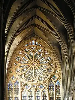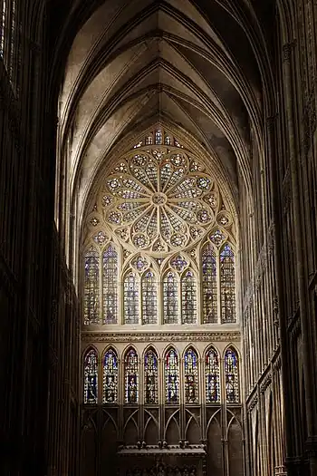 La verrière a des proportions monumentales. Haute de vingt-huit mètres, elle est large de treize mètres. Sa rosace est du type de la « Rota », une rose à composition radiale de onze mètres de diamètre. Son œil quadrilobé est entouré de seize quartiers trilobés au premier rang, de huit quadrilobes et huit trilobes alternés au second rang. Un écoinçon à cinq ajours complète le tympan. Sous la rose, quatre quadrilobes et sept écoinçons assurent la jonction avec le registre supérieur formé de huit lancettes trilobées. Le registre inférieur présente huit lancettes lancéolées. Les barlotières utilisées sont orthogonales, type d’assemblage commun depuis le XIIe siècle.