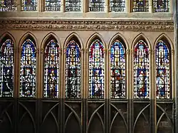 Les vitraux du registre inférieur ont été déplacés au moment de la construction du premier grand portail, en 1764, de Jacques-François Blondel. Il ne reste en place qu'un registre aveugle.