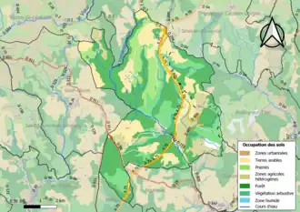 L'occupation des sols de la commune, telle qu'elle ressort de la base de données européenne d’occupation biophysique des sols Corine Land Cover (CLC), est marquée par l'importance des forêts et milieux semi-naturels (59,2 % en 2018), en diminution par rapport à 1990 (64,5 %). La répartition détaillée en 2018 est la suivante : forêts (47,6 %), terres arables (21,9 %), milieux à végétation arbustive et/ou herbacée (10,9 %), zones agricoles hétérogènes (10 %), prairies (8,6 %), espaces ouverts, sans ou avec peu de végétation (0,7 %), zones industrielles ou commerciales et réseaux de communication (0,3 %)[29].