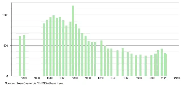 - ↑ Population municipale de référence en vigueur au 1er janvier 2025, millésimée 2022, définie dans les limites territoriales en vigueur au 1er janvier 2024, date de référence statistique : 1er janvier 2022.