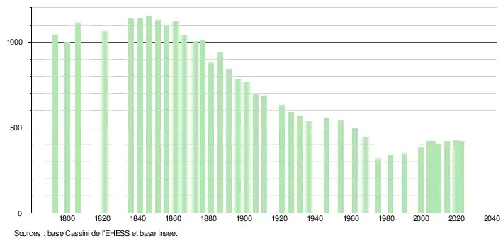 L'évolution du nombre d'habitants est connue à travers les recensements de la population effectués dans la commune depuis 1793. Pour les communes de moins de 10 000 habitants, une enquête de recensement portant sur toute la population est réalisée tous les cinq ans, les populations de référence des années intermédiaires étant quant à elles estimées par interpolation ou extrapolation[25]. Pour la commune, le premier recensement exhaustif entrant dans le cadre du nouveau dispositif a été réalisé en 2004[26].