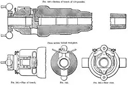 Verrou de culasse cylindrique Krupp[4] Mle C73 ; .- Verrou Krupp à bloc cylindrique d'un canon de campagne suisse calibre 84 mm (1879). Le bloc se translate latéralement pour charger l'arme.