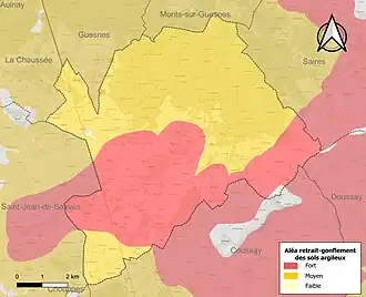 Les mouvements de terrains susceptibles de se produire sur la commune sont des affaissements et effondrements liés aux cavités souterraines (hors mines) et des tassements différentiels[20]. Afin de mieux appréhender le risque d’affaissement de terrain, un inventaire national permet de localiser les éventuelles cavités souterraines sur la commune[21]. Le retrait-gonflement des sols argileux est susceptible d'engendrer des dommages importants aux bâtiments en cas d’alternance de périodes de sécheresse et de pluie[22]. 99,6 % de la superficie communale est en aléa moyen ou fort (79,5 % au niveau départemental et 48,5 % au niveau national)[Carte 2]. Depuis le , en application de la loi ÉLAN, différentes contraintes s'imposent aux vendeurs, maîtres d'ouvrages ou constructeurs de biens situés dans une zone classée en aléa moyen ou fort[Note 1],[23].