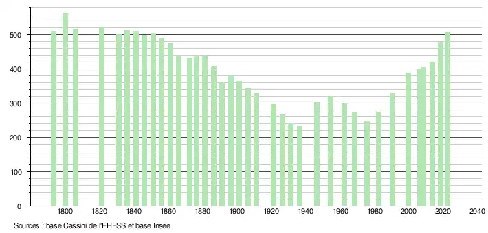 L'évolution du nombre d'habitants est connue à travers les recensements de la population effectués dans la commune depuis 1793. Pour les communes de moins de 10 000 habitants, une enquête de recensement portant sur toute la population est réalisée tous les cinq ans, les populations de référence des années intermédiaires étant quant à elles estimées par interpolation ou extrapolation[27]. Pour la commune, le premier recensement exhaustif entrant dans le cadre du nouveau dispositif a été réalisé en 2008[28].