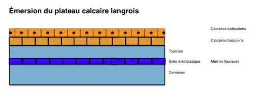 Le rebord du plateau de Langres forme une crête abrupte qui domine la dépression tertiaire de la Saône et les terrains liasiques du Sud-Est. Ce plateau calcaire s'est formé par accumulation des sédiments au fond des mers de l'ère secondaire. Il émerge définitivement au début de l'ère tertiaire.