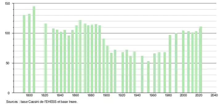 L'évolution du nombre d'habitants est connue à travers les recensements de la population effectués dans la commune depuis 1793. Pour les communes de moins de 10 000 habitants, une enquête de recensement portant sur toute la population est réalisée tous les cinq ans, les populations de référence des années intermédiaires étant quant à elles estimées par interpolation ou extrapolation[20]. Pour la commune, le premier recensement exhaustif entrant dans le cadre du nouveau dispositif a été réalisé en 2006[21].