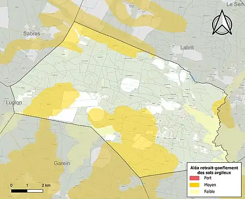 Le retrait-gonflement des sols argileux est susceptible d'engendrer des dommages importants aux bâtiments en cas d’alternance de périodes de sécheresse et de pluie. 29,5 % de la superficie communale est en aléa moyen ou fort (19,2 % au niveau départemental et 48,5 % au niveau national). Sur les 153 bâtiments dénombrés sur la commune en 2019, 13 sont en aléa moyen ou fort, soit 8 %, à comparer aux 17 % au niveau départemental et 54 % au niveau national. Une cartographie de l'exposition du territoire national au retrait gonflement des sols argileux est disponible sur le site du BRGM[20],[Carte 2].