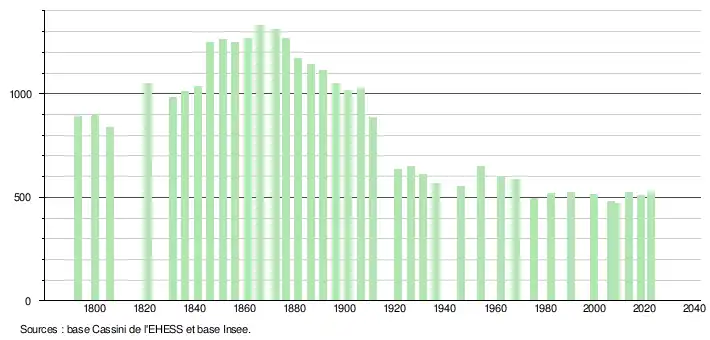 L'évolution du nombre d'habitants est connue à travers les recensements de la population effectués dans la commune depuis 1793. Pour les communes de moins de 10 000 habitants, une enquête de recensement portant sur toute la population est réalisée tous les cinq ans, les populations de référence des années intermédiaires étant quant à elles estimées par interpolation ou extrapolation[22]. Pour la commune, le premier recensement exhaustif entrant dans le cadre du nouveau dispositif a été réalisé en 2008[23].