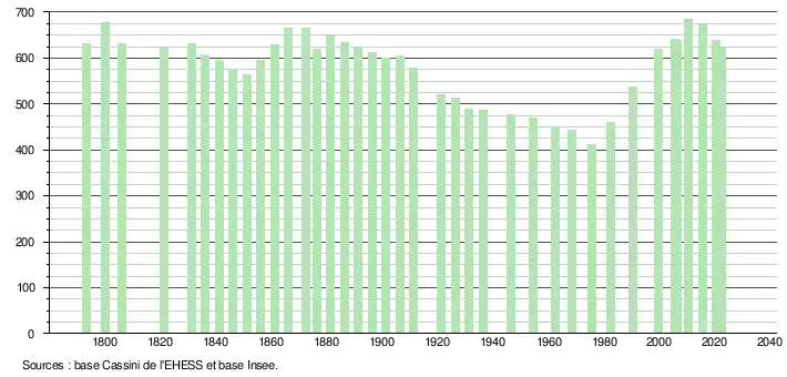 | L'évolution du nombre d'habitants est connue à travers les recensements de la population effectués dans la commune depuis 1793. Pour les communes de moins de 10 000 habitants, une enquête de recensement portant sur toute la population est réalisée tous les cinq ans, les populations de référence des années intermédiaires étant quant à elles estimées par interpolation ou extrapolation[18]. Pour la commune, le premier recensement exhaustif entrant dans le cadre du nouveau dispositif a été réalisé en 2005[19]. En 2022, la commune comptait 621 habitants[Note 3], en évolution de −9,87 % par rapport à 2016 (Eure : −0,25 %, France hors Mayotte : +2,11 %). |