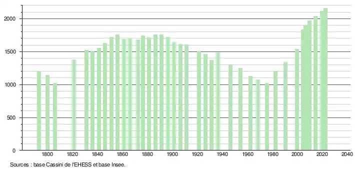 L'évolution du nombre d'habitants est connue à travers les recensements de la population effectués dans la commune depuis 1793. Pour les communes de moins de 10 000 habitants, une enquête de recensement portant sur toute la population est réalisée tous les cinq ans, les populations de référence des années intermédiaires étant quant à elles estimées par interpolation ou extrapolation[23]. Pour la commune, le premier recensement exhaustif entrant dans le cadre du nouveau dispositif a été réalisé en 2004[24].