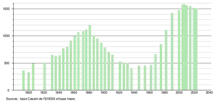 L'évolution du nombre d'habitants est connue à travers les recensements de la population effectués dans la commune depuis 1793. Pour les communes de moins de 10 000 habitants, une enquête de recensement portant sur toute la population est réalisée tous les cinq ans, les populations de référence des années intermédiaires étant quant à elles estimées par interpolation ou extrapolation[17]. Pour la commune, le premier recensement exhaustif entrant dans le cadre du nouveau dispositif a été réalisé en 2004[18].