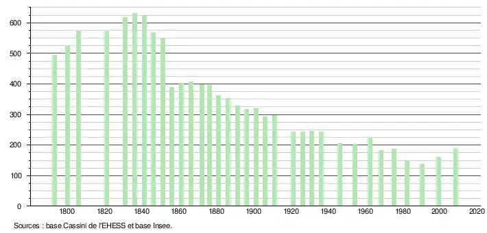 L'évolution du nombre d'habitants est connue à travers les recensements de la population effectués dans la commune depuis 1793. À partir du , les populations légales des communes sont publiées annuellement dans le cadre d'un recensement qui repose désormais sur une collecte d'information annuelle, concernant successivement tous les territoires communaux au cours d'une période de cinq ans. Pour les communes de moins de 10 000 habitants, une enquête de recensement portant sur toute la population est réalisée tous les cinq ans, les populations légales des années intermédiaires étant quant à elles estimées par interpolation ou extrapolation[8]. Pour la commune, le premier recensement exhaustif entrant dans le cadre du nouveau dispositif a été réalisé en 2008[9],[Note 1].