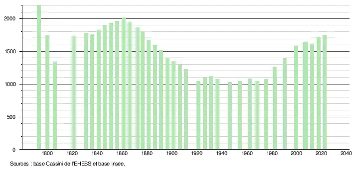 L'évolution du nombre d'habitants est connue à travers les recensements de la population effectués dans la commune depuis 1793. Pour les communes de moins de 10 000 habitants, une enquête de recensement portant sur toute la population est réalisée tous les cinq ans, les populations de référence des années intermédiaires étant quant à elles estimées par interpolation ou extrapolation[23]. Pour la commune, le premier recensement exhaustif entrant dans le cadre du nouveau dispositif a été réalisé en 2007[24].