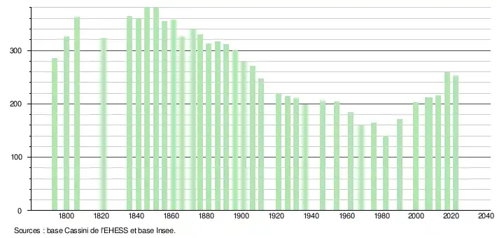 L'évolution du nombre d'habitants est connue à travers les recensements de la population effectués dans la commune depuis 1793. Pour les communes de moins de 10 000 habitants, une enquête de recensement portant sur toute la population est réalisée tous les cinq ans, les populations de référence des années intermédiaires étant quant à elles estimées par interpolation ou extrapolation[12]. Pour la commune, le premier recensement exhaustif entrant dans le cadre du nouveau dispositif a été réalisé en 2007[13].