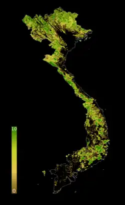 Le territoire vietnamien est en majeure partie composé de collines, surtout dans le Sud, et de montagnes élevées, essentiellement dans le Nord, qui culminent au Phan Xi Păng (3 143 m), près de Sa Pa. Les monts Truong Son (cordillère Annamtique), qui forment les hauts plateaux du Sud-Ouest, courent le long des frontières du Laos et du Cambodge. D'énormes rochers parsèment les versants des chaînes côtières granitiques proches de Nha Trang et du col de Hai Van, à proximité de Da Nang. Le sous-sol vietnamien est riche en étain, zinc, argent, pierres précieuses et charbon. Si la partie occidentale des hauts plateaux, près de Buôn Ma Thuột et de Pleiku, est renommé pour son sol volcanique rouge, extrêmement fertile, on trouve du pétrole et du gaz naturel sur le plateau continental[32]. Les formations karstiques du Nord sont toutefois le relief le plus emblématique du pays, en particulier les paysages de la baie d'Along, de la baie de Bai Tu Long, des environs de Ninh Binh et de la région de Phong Nha. Dans les baies d'Hạ Long et de Bai Tu Long, l'immense plateau calcaire s'est progressivement enfoncé dans la mer et les anciens pics se dressent désormais.