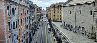 Elle est traversée par de nombreuses rues - en partie piétonnes lors des travaux de réaménagement du G8 de 2001 - regorgeant de boutiques élégantes. Elle sert de charnière entre la partie centre-est de la ville qui fait face à l'est du ruisseau Bisagno à la partie la plus à l'ouest développée au-delà du largo della Zecca, vers Porta Principe.