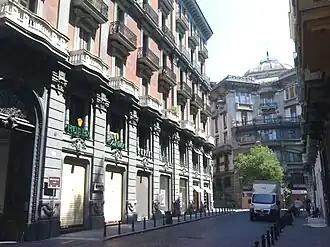 Vue de la Via dei Mille, avec le Palazzo Mannajuolo en arrière-plan. A gauche les escaliers Francesco d'Andrea, qui relient la rue aux rampes de Brancaccio ; à droite la suite du tracé routier, via Gaetano Filangieri. |