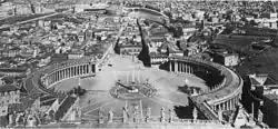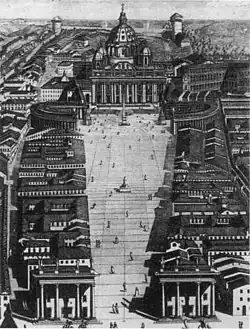 Une nouvelle occasion se présente lorsque Le Bernin est chargé de réaménager la terrasse devant la basilique en 1656. Après avoir écarté plusieurs croquis, il réalise un espace ouvert colossal en forme d'ellipse. Compte-tenu du coût potentiel pour le dégagement du Borgo, le Bernin décide plutôt d'utiliser le dédale de bâtiments médiévaux mal entretenus pour masquer toute vue des structures du Vatican à une distance significative. De cette manière, les pèlerins sortent de l'obscurité relative de la ville pour pénétrer dans le vaste espace ouvert et découvrir la grandeur de la place et de ses bâtiments environnants – un spectacle destiné à inspirer la crainte des visiteurs novices au siège du pouvoir du Saint-Siège[5]. Le Bernin prévoit initialement de démolir un carré d'environ 100 m de côté face à la place, remplissant l'espace avec une troisième colonnade (ou « terzo braccio ») pour correspondre avec les deux encore debout aujourd'hui. Cela offrirait un point de vue plus long, avec pour visiteurs, un meilleur angle de vue de la nouvelle basilique. La mort de son patron, le pape Alexandre VII, met un terme aux projets du Bernin. Le troisième ensemble de colonnes est abandonné et la place reste ouverte et incomplète[10].