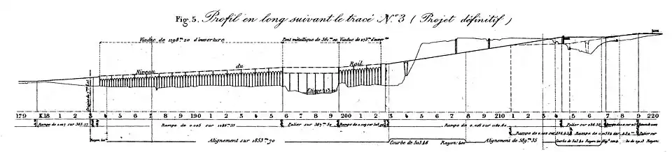 Le niveau de la plate-forme sur le tablier métallique n'était encore qu'à la cote 134,30, mais le remblai à la suite était, sur 140 mètres, en pente de 0,01, et sur le reste de la longueur, en rampe de 0,016. La profondeur maximum de la tranchée ouverte dans le coteau de rive droite dépassait néanmoins 13 mètres.