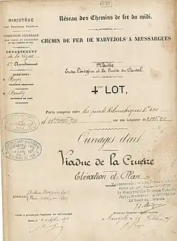 En , une annonce du ministère des Travaux publics dans le Journal officiel de la République française prévoit l'adjudication de travaux à exécuter sur le chemin de fer de Marvejols à Neussargues. Il s'agit du 4e lot de la construction, compris entre les points kilométriques 8,400 et 11,290 sur une longueur de 2 890,50 m, dont le principal ouvrage est le « viaduc de Crueize » d'une longueur de 216 m et une hauteur de 63,20 m. La dépense prévue pour cet ensemble, hors coût des imprévus, est estimée à 2 717 203,08 francs de l'époque[6].