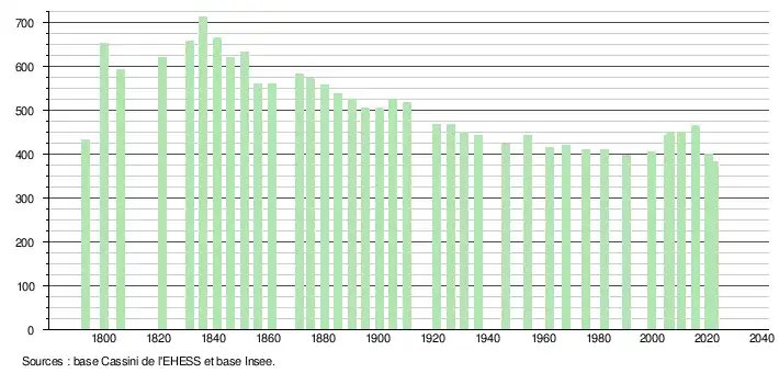 L'évolution du nombre d'habitants est connue à travers les recensements de la population effectués dans la commune depuis 1793. Pour les communes de moins de 10 000 habitants, une enquête de recensement portant sur toute la population est réalisée tous les cinq ans, les populations de référence des années intermédiaires étant quant à elles estimées par interpolation ou extrapolation[19]. Pour la commune, le premier recensement exhaustif entrant dans le cadre du nouveau dispositif a été réalisé en 2005[20].