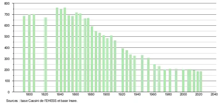 L'évolution du nombre d'habitants est connue à travers les recensements de la population effectués dans la commune depuis 1793. Pour les communes de moins de 10 000 habitants, une enquête de recensement portant sur toute la population est réalisée tous les cinq ans, les populations de référence des années intermédiaires étant quant à elles estimées par interpolation ou extrapolation[12]. Pour la commune, le premier recensement exhaustif entrant dans le cadre du nouveau dispositif a été réalisé en 2008[13].