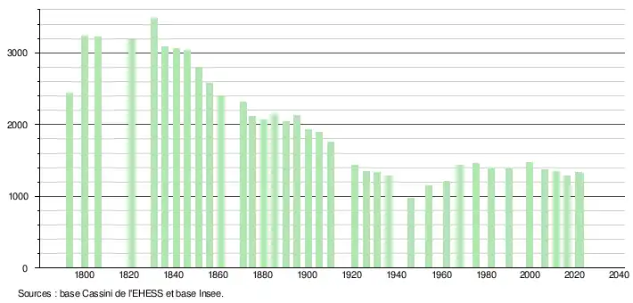 L'évolution du nombre d'habitants est connue à travers les recensements de la population effectués dans la commune depuis 1793. Pour les communes de moins de 10 000 habitants, une enquête de recensement portant sur toute la population est réalisée tous les cinq ans, les populations de référence des années intermédiaires étant quant à elles estimées par interpolation ou extrapolation[24]. Pour la commune, le premier recensement exhaustif entrant dans le cadre du nouveau dispositif a été réalisé en 2006[25].