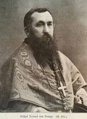 Il faudra attendre deux ans plus tard pour que le père Jean Derouet, pro-vicaire de Mgr Carrie lui succède. Le , il est nommé évêque titulaire (in partibus) de Camachus (de) et vicaire apostolique pour le Bas-Congo français, devenu plus tard Vicariat apostolique de Loango. Il est consacré le par Alexandre-Louis-Victor-Aimé Le Roy, évêque titulaire d'Alinda (de)[19] dans la chapelle du saint-Esprit à Chevilly-Larue.