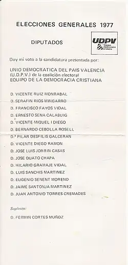 Ruiz Monrabal est nommé secrétaire général de l'UDPV[3],[2] et figure en tête de liste aux Élections générales espagnoles de 1977 pour la coalition Equipo Demócrata Cristiano del Estado Español, dont la principale revendication est l'obtention d'un Statut d'autonomie pour le Pays valencien, mais il n'est pas élu. Après cet échec, il abandonne l'UDPV et intègre l'Union du centre démocratique (UCD), au sein duquel il est élu député pour Valence de la Ire législature (1979-1982)[3],[2].