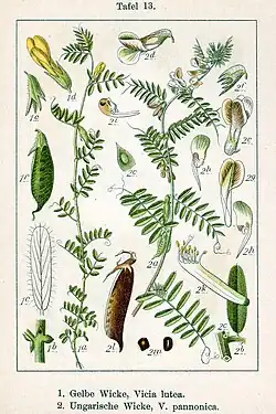 - (en) Cet article est partiellement ou en totalité issu de l’article de Wikipédia en anglais intitulé « Vicia pannonica » (voir la liste des auteurs).