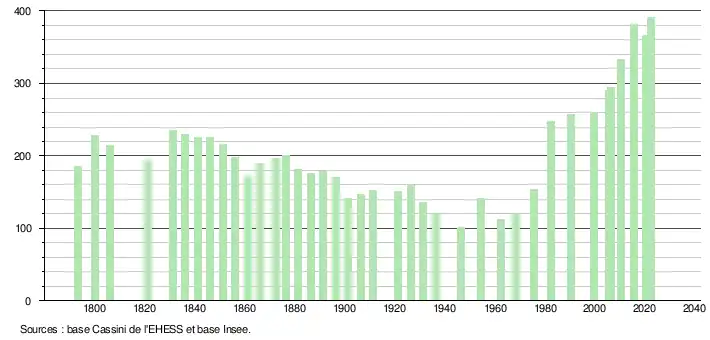 L'évolution du nombre d'habitants est connue à travers les recensements de la population effectués dans la commune depuis 1793. Pour les communes de moins de 10 000 habitants, une enquête de recensement portant sur toute la population est réalisée tous les cinq ans, les populations de référence des années intermédiaires étant quant à elles estimées par interpolation ou extrapolation[19]. Pour la commune, le premier recensement exhaustif entrant dans le cadre du nouveau dispositif a été réalisé en 2005[20].