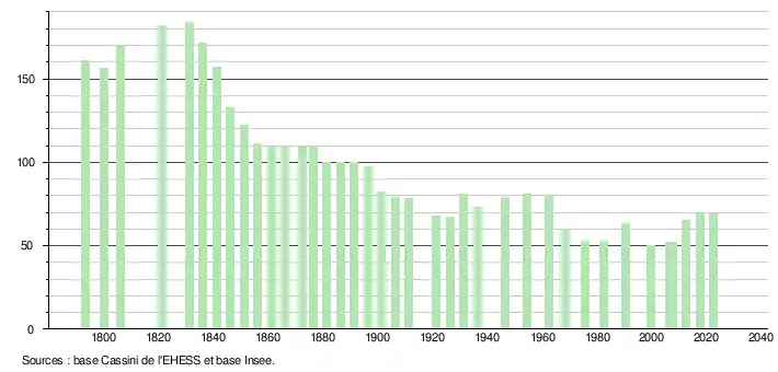 L'évolution du nombre d'habitants est connue à travers les recensements de la population effectués dans la commune depuis 1793. Pour les communes de moins de 10 000 habitants, une enquête de recensement portant sur toute la population est réalisée tous les cinq ans, les populations de référence des années intermédiaires étant quant à elles estimées par interpolation ou extrapolation[31]. Pour la commune, le premier recensement exhaustif entrant dans le cadre du nouveau dispositif a été réalisé en 2007[32].