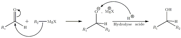 - Addition d'un composé carbonylé, une cétone ou un aldéhyde, dans la solution contenant le réactif de Grignard. L'atome de carbone lié au magnésium est transféré vers l'atome de carbone du carbonyle, et l'oxygène du carbonyle est attaché au magnésium pour donner un alcoolate. Cette réaction est un exemple d'une addition nucléophile sur un carbonyle. Après l'addition, le mélange réactionnel est traité par un acide pour donner un alcool et permettre ainsi d'éliminer le sel de magnésium.