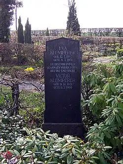 Victor Klemperer mourut en âgé de 78 ans. Il repose au cimetière de Dresde-Dölzschen (de) auprès d'Eva.