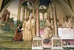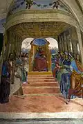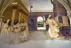 ![]() | 12 | Benoît reçoit deux jeunes Romains, Maur et Placide | La renommée de Benoît commence à grandir et « les citoyens de Rome, distingués par leur naissance et leur piété, vinrent le visiter en foule, et lui offrirent leurs enfants pour les élever dans la crainte du Seigneur. Eutyche lui présenta Maur, et le patrice Tertulle, son fils Placide »[14]. Les deux jeunes vont devenir d'importants collaborateurs de Benoît. Ils se présentent accompagnés de leurs pères et d'une escorte impressionnante, que l'on voit quitter Rome (à l'arrière-plan), entrer dans Subiaco (au second plan) et occuper en désordre le premier plan. Cette fresque animée et débordante de personnages inclut des portraits frappants, et certains y ont reconnu ceux de Signorelli et de Fra Angelico. |