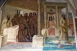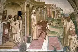 ![]() | 32 | Benoît excommunie deux religieuses puis les absout après leur mort | La scène dépeinte dans cette fresque se déroule à l'intérieur d'une église, pendant la célébration de la messe. Au moment où le prêtre prononce les paroles : « Que quiconque ne communie pas se retire », une femme[26] voit surgir de leur tombe deux moniales privées de la communion, peu de temps avant leur mort, par saint Benoît[27]. La composition présente la scène vue du fond de l'église. Au premier plan, les femmes agenouillées tournent le dos au spectateur. L'une d'elles se tourne vers la gauche, où deux nonnes à la peau verdâtre se hissent hors de leur caveau. À droite, le peintre a choisi de représenter de profil et de trois-quarts face les visages des hommes, assis sur des bancs, les plus jeunes saisissants de beauté. Au second plan, dans le chœur soutenu par de puissantes colonnes, trois officiants célèbrent la messe, accompagnés par une chorale masculine. Sur la droite du tableau, traité sur le mode de la miniature, saint Benoît réconcilie les moniales, qu'il avait trop sévèrement châtiées, en leur donnant la communion. |