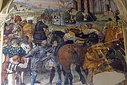 accompagnés d'un vieux sage en robe bordée de fourrure, contemplent la scène d'un air incrédule. Dans la partie supérieure de la fresque, Riggio rend compte à Totila de sa visite à Benoît. Dans un camp de tentes surmontées de leurs pavillons l'écuyer a mis un genou en terre devant son roi. On retrouve, à côté de Riggio, le vieux sage du premier-plan, auquel font pendant les deux conseillers barbus représentés en conciliabule derrière le roi. La scène, résolument située dans un camp militaire du Cinquecento, regorge de personnages, de poses et d'expressions mises en scène de manière résolument théâtrale[22]. |