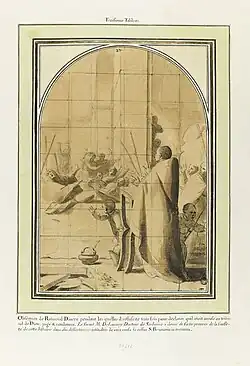 ![]() Le troisième tableau donne l'explication de la présence du diable : pendant les funérailles, le cadavre de Diocrès se relève trois fois pour reconnaître qu'il est accusé, jugé et condamné par Dieu, ce qui révèle à tous que sa vie n'a pas été en accord avec ses enseignements. Les paroles qu'il profère sont inscrites sur des écriteaux accrochés à son lit : Justo Dei judicio accusatus sum, Justo Dei judicio judicatus sum, Justo Dei judicio condemnatus sum (« Par le juste jugement de Dieu je suis accusé... jugé... condamné. »), alors que d'autres représentations mettent ces mots dans des banderoles sortant de la bouche du damné.[17]. La figure de Diocrès exprime l'horreur de sa damnation[18]. Toutefois le tableau final est plus retenu que les dessins préparatoires. La chasuble brodée du prêtre au premier plan à droite contraste avec le jeu des blancs, des gris et des noirs du deuxième plan[19]. | ||||
