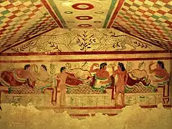 Les fresques, présentes ou relevées dans beaucoup de tombes des nécropoles étrusques, exposent les Étrusques dans le faste du banquet du Triclinium, buvant et mangeant avec opulence (sensible aussi dans le couvercle des sarcophages figurés), la richesse des vaisselles et objets quotidiens (dés) retrouvées dans les tombes, accompagnant le défunt dans l'au-delà avec le souvenir de sa vie terrestre.