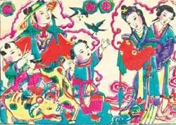 Le rouge est une couleur auspicieuse associée aux noces. La coutume de faire tenir lors de la cérémonie de mariage l’extrémité d’un fil rouge par chacun des époux était déjà connue sous les Tang. Le fil a été remplacé par un mouchoir sous les Song. Présenter deux personnes en vue du mariage se dit « tendre le fil rouge » [1]