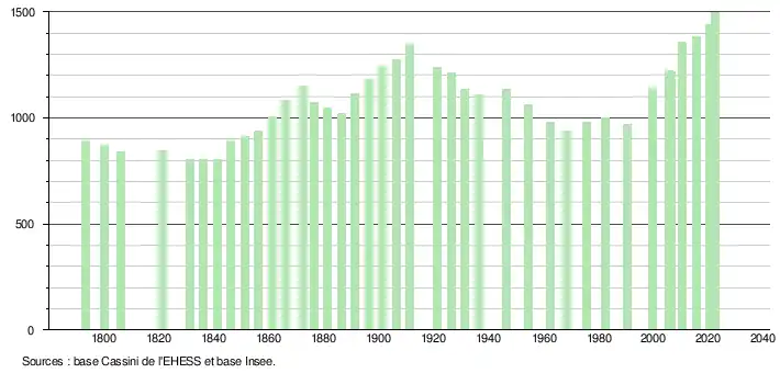 L'évolution du nombre d'habitants est connue à travers les recensements de la population effectués dans la commune depuis 1793. Pour les communes de moins de 10 000 habitants, une enquête de recensement portant sur toute la population est réalisée tous les cinq ans, les populations de référence des années intermédiaires étant quant à elles estimées par interpolation ou extrapolation[39]. Pour la commune, le premier recensement exhaustif entrant dans le cadre du nouveau dispositif a été réalisé en 2005[40].