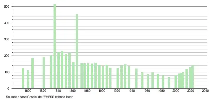 L'évolution du nombre d'habitants est connue à travers les recensements de la population effectués dans la commune depuis 1793. Pour les communes de moins de 10 000 habitants, une enquête de recensement portant sur toute la population est réalisée tous les cinq ans, les populations de référence des années intermédiaires étant quant à elles estimées par interpolation ou extrapolation[13]. Pour la commune, le premier recensement exhaustif entrant dans le cadre du nouveau dispositif a été réalisé en 2004[14].