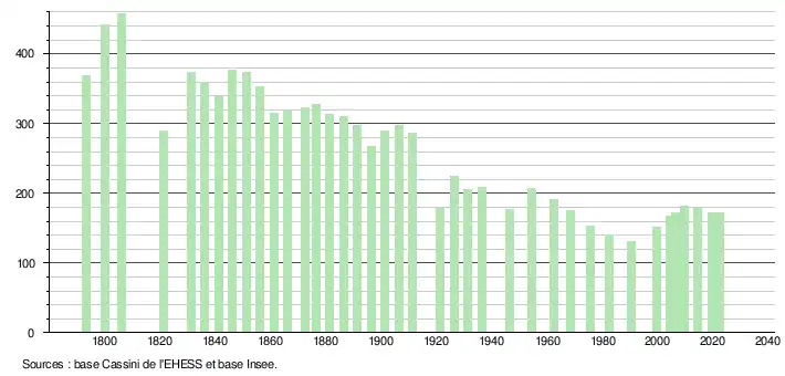 L'évolution du nombre d'habitants est connue à travers les recensements de la population effectués dans la commune depuis 1793. Pour les communes de moins de 10 000 habitants, une enquête de recensement portant sur toute la population est réalisée tous les cinq ans, les populations de référence des années intermédiaires étant quant à elles estimées par interpolation ou extrapolation[25]. Pour la commune, le premier recensement exhaustif entrant dans le cadre du nouveau dispositif a été réalisé en 2004[26].