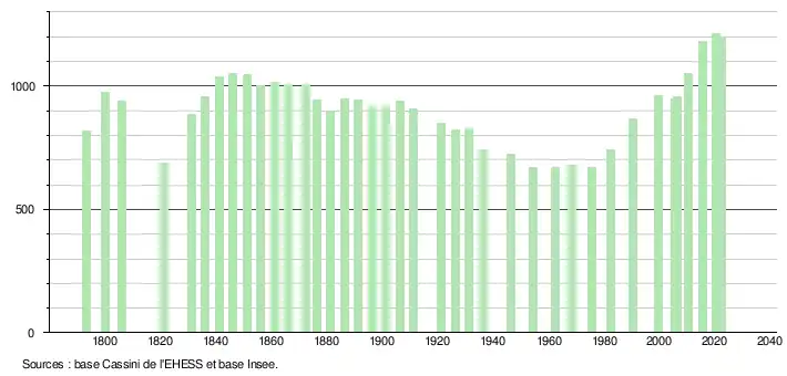 L'évolution du nombre d'habitants est connue à travers les recensements de la population effectués dans la commune depuis 1793. Pour les communes de moins de 10 000 habitants, une enquête de recensement portant sur toute la population est réalisée tous les cinq ans, les populations de référence des années intermédiaires étant quant à elles estimées par interpolation ou extrapolation[28]. Pour la commune, le premier recensement exhaustif entrant dans le cadre du nouveau dispositif a été réalisé en 2005[29].
