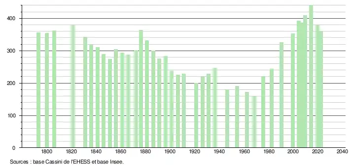L'évolution du nombre d'habitants est connue à travers les recensements de la population effectués dans la commune depuis 1793. Pour les communes de moins de 10 000 habitants, une enquête de recensement portant sur toute la population est réalisée tous les cinq ans, les populations de référence des années intermédiaires étant quant à elles estimées par interpolation ou extrapolation[20]. Pour la commune, le premier recensement exhaustif entrant dans le cadre du nouveau dispositif a été réalisé en 2004[21].
