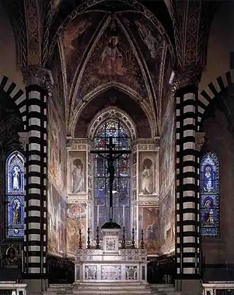 Les fresques détaillent certains épisodes emblématiques de la vie de deux saints : saint Étienne, titulaire de la cathédrale de Prato et Jean le Baptiste protecteur de la ville voisine de Florence.