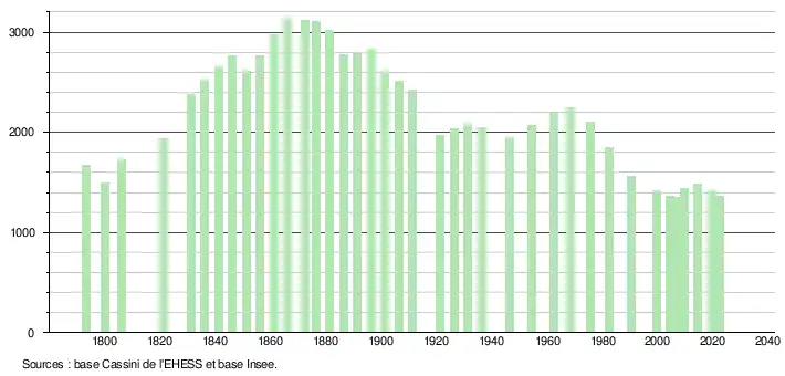 L'évolution du nombre d'habitants est connue à travers les recensements de la population effectués dans la commune depuis 1793. Pour les communes de moins de 10 000 habitants, une enquête de recensement portant sur toute la population est réalisée tous les cinq ans, les populations de référence des années intermédiaires étant quant à elles estimées par interpolation ou extrapolation[20]. Pour la commune, le premier recensement exhaustif entrant dans le cadre du nouveau dispositif a été réalisé en 2004[21].