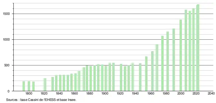 | L'évolution du nombre d'habitants est connue à travers les recensements de la population effectués dans la commune depuis 1793. Pour les communes de moins de 10 000 habitants, une enquête de recensement portant sur toute la population est réalisée tous les cinq ans, les populations de référence des années intermédiaires étant quant à elles estimées par interpolation ou extrapolation[26]. Pour la commune, le premier recensement exhaustif entrant dans le cadre du nouveau dispositif a été réalisé en 2006[27]. En 2022, la commune comptait 1 682 habitants[Note 2], en évolution de +4,73 % par rapport à 2016 (Landes : +5,78 %, France hors Mayotte : +2,11 %). |